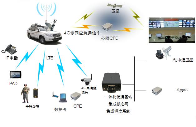 應(yīng)急通信車內(nèi)配備一體化便攜基站,集成核心網(wǎng)和調(diào)度臺,應(yīng)急通信車周邊人員可通過各類終端接入LTE專網(wǎng);