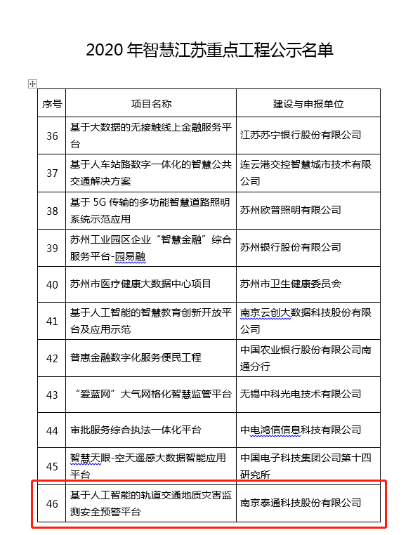 喜訊丨泰通科技《基于人工智能的軌道交通地質(zhì)災(zāi)害監(jiān)測(cè)安全預(yù)警平臺(tái)項(xiàng)目》上榜2020年智慧江蘇重點(diǎn)工程